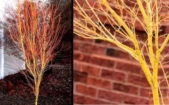 One of our personal favorites, the Bihou Japanese Maple is a member of the Coral Bark family. But what’s unique about this one is that the branches and trunk are bright yellow year round! After the leaves fall for winter the smaller stems towards the top of the tree take on a bright red hue which contrasts marvelously with the yellow branches and trunk below. During the warm season, the lovely light green foliage contrasts wonderfully with the golden bark on an upright tree from 12 to 15 feet in height with a 8 to 12 foot spread. Fall foliage is yellow. A true masterpiece of a tree that deserves a spot in every landscape where it will grow!Â
