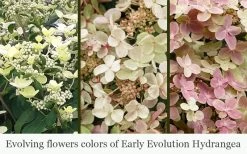 In more ways than one, the Early Evolution is unlike any other Hydrangea we’ve ever seen or grown before. Though it’s a Hydrangea paniculata (panicle hydrangea) it begins flowering much earlier than any other varieties in the species. Instead of the typical cone or elongated flower clusters, those of Early Evolution are more dome-shaped and produced in such abundance they nearly cover the foliage on a compact mound only 24 to 30 inches tall and equally as wide. The flower buds start opening late May to early June, hence “Early” in the name. “Evolution’ in the name refers to the ever-evolving colors of the flowers, which can appear at the same time on the same plant. The flowers start a soft lime-green transitioning to antique shades of creamy white aging to blush pink and finally a darker dusty pink. Its diminutive size and evolving flower colors over a long period of 5 months make Early Evolution a perfect fit for smaller garden spaces and in containers that can be situated on patios, decks, porches, balconies and other outdoor living spaces where they can be enjoyed from close up. Â