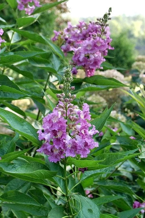 An intergeneric hybrid of desert willow (Chilopsis linearis) and catalpa (Catalpa sp.). El Nino Desert Orchid thrives in a much wider range and is much easier to care for than either of its parents. It is tolerant to the poor soils and dry heat of the West, as well as the heat and humidity in southern climates. It features abundant clusters of absolutely beautiful, sweetly scented, orchid-like flowers in purple shades. Depending on your location the flowers start coming in late spring to early summer and continue sporadically through the summer. Destined to be a lovely asset in the landscape, and a conversation piece for sure, at 6 to 8 feet tall and 5 to 6 feet wide El Nino is a fine accent in small to medium size spaces or in groupings where space will allow, though we do suggest spaced groupings so that each plant stands out on it’s own. That said, you can create a hedge with it if you like, or remove lower branches to form a small tree, or grow it in a container. The choice is yours!Â