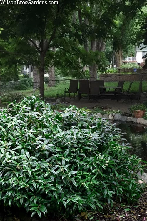 Growing in a dense spreading mound 2 to 3 feet tall and 3 to 4 feet wide, the Fragrant Mountain Sweetbox is ideal for use as an accent in smaller garden spaces and containers or in groupings or as a border or groundcover in shady landscape or woodland borders. It also is a perfect evergreen for shady home foundation plantings. In our gardens, it thrives in the shade under the canopies of large shade trees where not much else will grow. Plant near outdoor living and sitting spaces so the sweet fragrance of the flowers can be enjoyed from close up. A fine addition to fragrance gardens, woodland gardens, Asian gardens, rock gardens, container gardens, around water gardens and in the Xeriscape (low water needs).