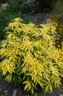 With outstanding color and a unique texture like bamboo, ‘Goldfingers’ Mexican Orange Blossom was selected for its brilliant glowing foliage and dense mounding habit. With 6 hours or more of direct sunlight per day the finely divided palmate leaves will be bright yellow throughout the season. Otherwise, in more shade, the foliage will be chartreuse to light green. Abundant clusters of citrus scented white flowers resembling those of orange blossoms are an extra-added bonus in spring and again in fall. When left to grow naturally Goldfingers will form a highly attractive mounding evergreen shrub 4 to 5 feet tall and equally as wide, making it a fine choice as a specimen in smaller garden spaces and larger containers or in groupings or as a natural hedge where space allows. This glowing wonder will not go unnoticed in the garden!