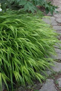 Adored for its absolutely beautiful cascading foliage, Hakone Grass, also known as Japanese Forest Grass, is a hardy ornamental grass with foliage resembling that of some types of bamboo. The gracefully arching bright green leaves to 10 inches long and 3/8 of an inch wide form dense, spreading, cascading mounds to 18 inches tall and 24 to 30 inches wide. With the arrival of cooler temperatures in fall the foliage often becomes blushed with shades of pink and red. Excellent as an accent in small garden spaces and containers or in groupings or as a border along shady paths and around patios or for cascading over walls and draping over rocks. In its native habitat in Japan it thrives in moist mountain and woodland areas, including areas around Mt. Hakone from which both its genus name and common name come from. In your landscape give it part shade to full shade and a consistently damp to moist soil. Avoid direct afternoon sun. You might be happy to know this one is deer resistant.