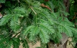 If you’ve ever seen the giant redwood trees in California and always thought you might want to grow one in your own landscape, meet ‘Inman’s Select’, a select variety propagated from an established specimen in Inman, South Carolina. Redwoods, scientifically known as Sequoia sempervirens, are exceedingly rare outside of their normal habitat on the west coast, but this one in South Carolina has thrived there since around 1950 reaching a height of around 100 feet with a width of about 20 feet and a trunk circumference of about 12 feet. Redwood trees are fast growing when young, adding 3 to 5 feet in height per year, but growth does slow down with age. Very easy to grow, it features very soft and feathery fern-like evergreen foliage that emerges light green in spring maturing to deeper green in summer. Fissured bark is a very attractive reddish orange, which contrasts beautifully with the green leaves. A truly spectacular tree that deserves a spot in any landscape where it will grow (USDA Zones 7a-9b), and that can accommodate its size. We suggest planting it at least 30 feet away from homes and septic lines.Â