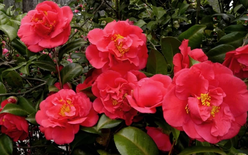 With a sweet scent that is rarely found in Camellia japonica culitvars, Kramers Supreme produces an abundance of large, fully double peony-form flowers with ruffled turkey-red petals and cute yellow stamens peeking out between. It has a long flowering season lasting for months from mid-winter into spring during a time when we need color in the landscape the most. The flowers are perfect for cutting and use in indoor flower arrangements or float just one in a bowl of water.