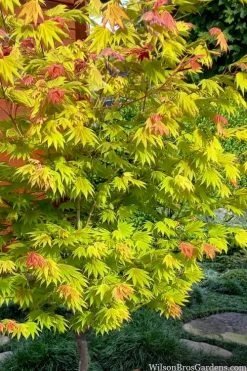 Acer shirasawanum ‘Moonrise’ is a relatively new and exciting Full Moon Japanese maple cultivar that is sure to delight the eye with spectacular changing colors throughout the season. In spring, new leaves emerge bright red changing over to brilliant chartreuse with orange tones during summer. Fall brings glorious shades of orange and red. This one has shown good resistance to leaf burn when growing in the sun. That said, we think Japanese maples look more at home in a spot where there’s some filtered sun or shade in the afternoon. A somewhat slower grower to 10 to 12 feet tall and 6 to 8 feet wide, this luminous small tree is excellent for use in pots and smaller garden spaces as a focal point specimen that is sure to light up the landscape!