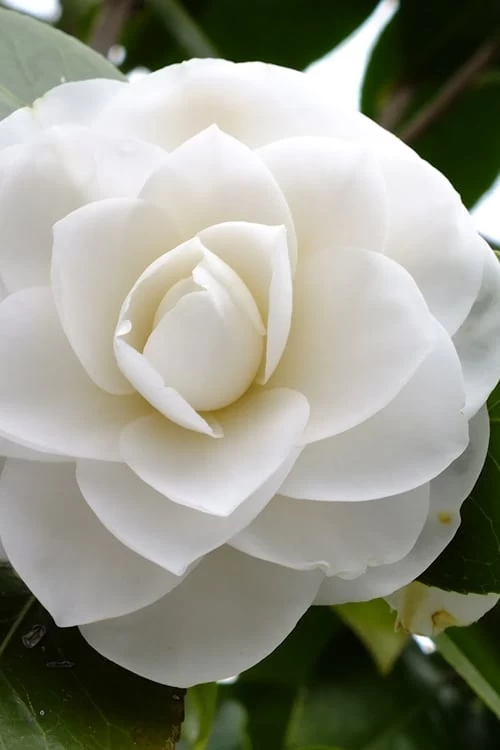 A vigorous grower with a dense and upright columnar habit, the Morning Glow Camellia produce an abundance of gorgeous, large, and formal double flowers with rows of overlapping petals that are slightly cupped and porcelain white. No visible stamens though there is a soft yellow glow at the center. The gorgeous flowers appear mid to late winter and continue well into spring. Perfect for cutting and use in indoor flower arrangements or just float one in a bowl of water.