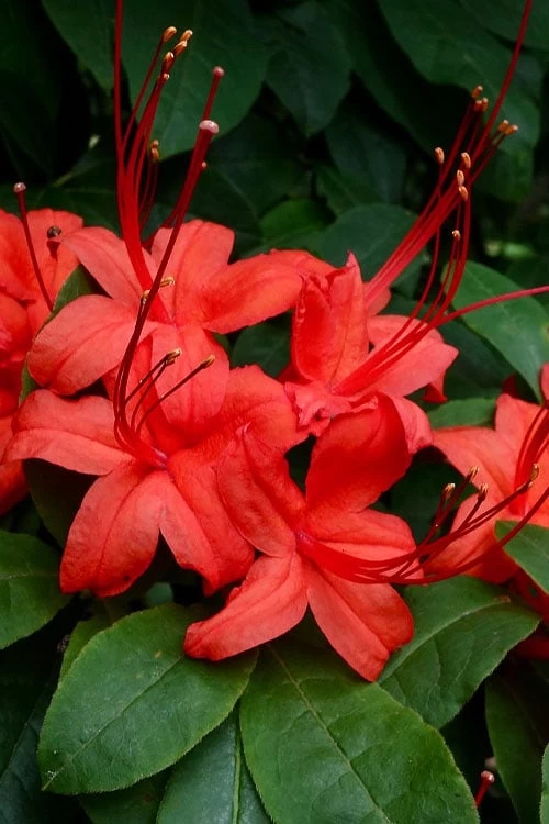 One of the latest of all North American native azaleas to bloom, the Plum Leaf Azalea, Rhododendron prunifolium, sets the landscape ablaze in mid to late summer with its abundant fiery red to orange-red trumpet flowers against a backdrop of shiny, dark green leaves. Butterflies and hummingbirds will certainly appreciate the late-season flowers. The foliage turns a plum color in fall, hence the name. All grown up, the Plum Leaf Azalea might reach 8 to 12 feet tall and 6 to 8 feet wide with visually pleasing layered branching. An excellent specimen or grouping in partially shaded woodland or landscape borders and other areas where it will have some shade or filtered sun during the afternoon hours. The Plum Leaf Azalea is one that will always have you looking forward to its delightful bloom in late summer.