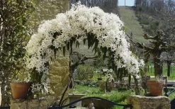 Growing over 20 feet long, the Snowdrift Evergreen Clematis needs plenty of room to grow. This magnificent vine is ideal for use to cover fences, arbors, pergolas and other overhead structures. Can be grown on a large trellis against a wall, which creates a very beautiful “live wall.” A fine addition to fragrance gardens, white theme gardens, and tropical-look gardens.